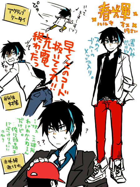 容姿:黒髪だが、スカイブルーのメッシュが入ってる。